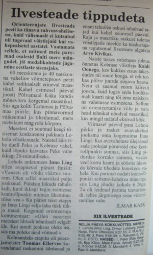 Meie lastevõitlus käis aga parimate sportlastega samadel radadel, ainult me ei võidelnud finaali pääsemise eest, vaid unistasime pääseda rajale enne lohutusjooksu ühisstarti, mida anti päeva lõpus neile, kelle kaaslased veel polnud jõudnud metsast välja tulla. Oskused olid napid, ning ekslesime sisetallatud lohade labürindis, ja ilmselt pidime leppima ka lohutusjooksuga. Juhendi järgi ei lubatud alla 17 aastaseid startida, aga meie seltskond oli hästi noor, ju siis treener pidi luiskama veidi sünniaastate kohta. Mäletan, et võistkonna etapi valikul arvestati ka seda, et esimest vahetust jooksev laps ulataks kaarti stardiliinilt haarama.